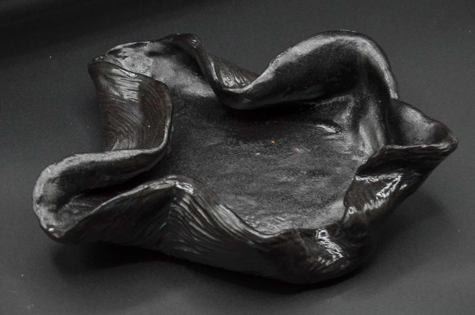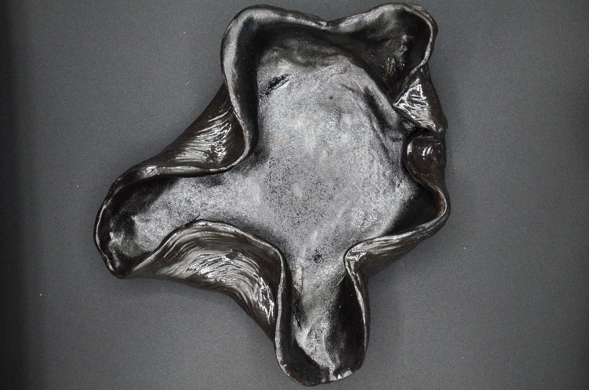 The glaze sits in deep black tones with subtle metallic shifts, almost like wet stone under low light. Parts of the surface stay matte, others reflect just enough to create that “after the rain” sheen. The interior stays calmer and more grounded, while the edges rise and curl like dark waves.